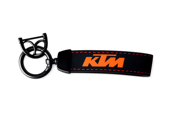 The black strap features the iconic KTM logo in bold orange, finished with contrasting red stitching for a sharp, high-quality look. The robust metal keyring and swivel clip ensure secure attachment while allowing smooth movement, making it practical as well as stylish.